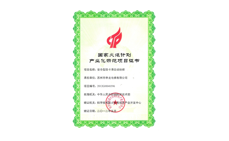 國家火炬計(jì)劃產(chǎn)業(yè)化示范項(xiàng)目證書